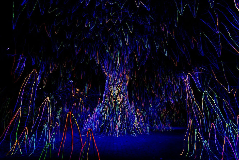 在瀨戶內海參與了群眾共創藝術的體驗後,《光蟲》系列開始向融合環境轉化,芭蕉林裡出現了工筆般螢光線條所構築的《光之生態圈》;而後「大型場域」的再現便成為了主要的題材,《消逝的駐留》重現過的時空切片,有已經倒塌的巨木、蒸發的河流、缺水的瀑布、光禿的鐘乳石洞等等,使用具有「歲月痕跡」的金屬線,織成過去時間的某一片段中,曾存在的地景;辛綺此一系列,就像是將時空切成片段,放上載玻片,壓縮、照射、看見。